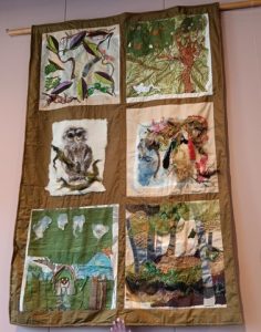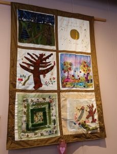 Op een lap van 50 bij 50 cm heeft iedereen dit thema op haar eigen wijze vormgegeven, waarna de lappen werden samengevoegd tot de vier wandkleden die hier hangen.